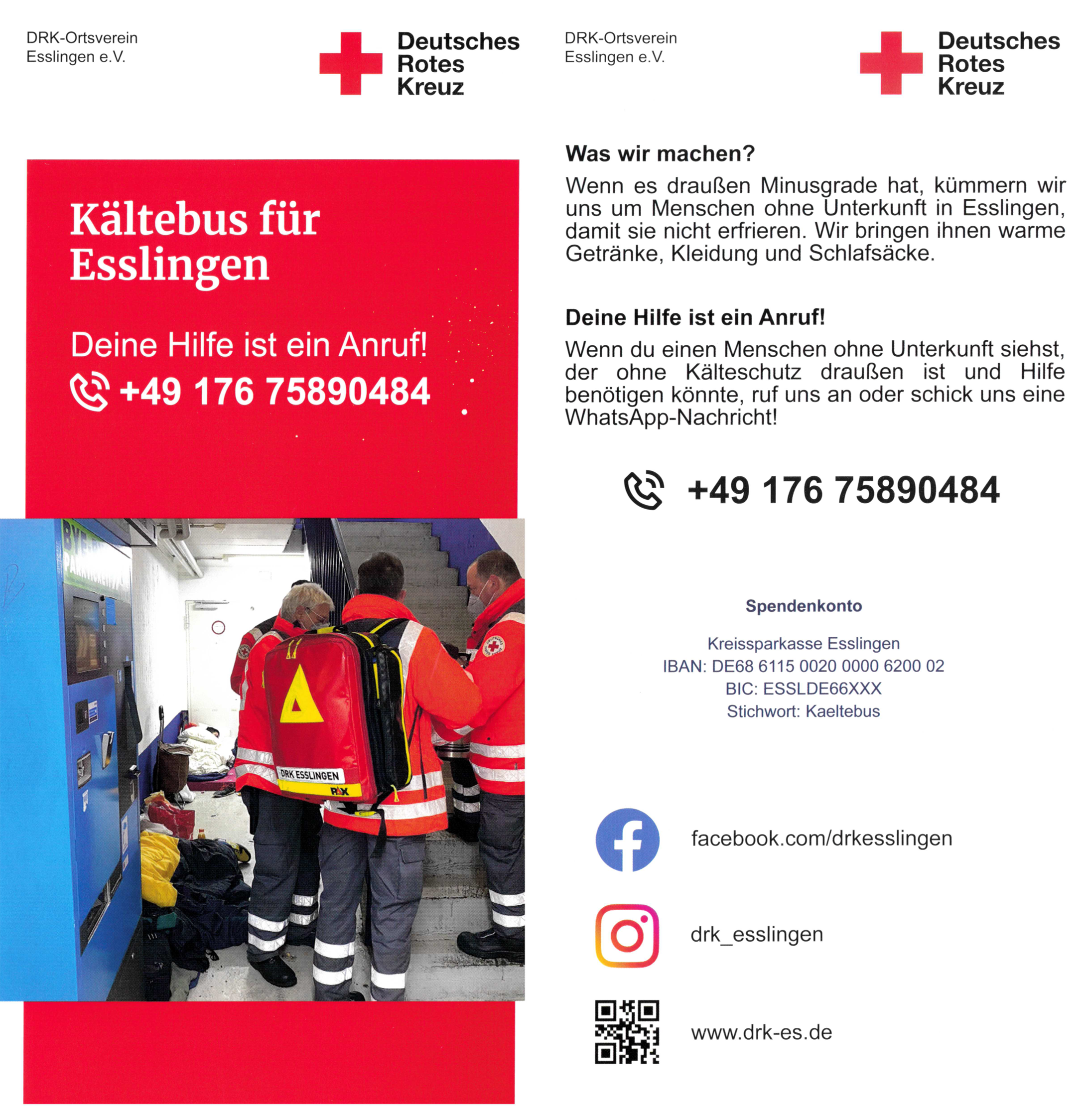 Nicht jeder von uns hat es wohlig warm zu Hause, genug zu essen und wärmende Kleidung. Leider gibt es bei uns viele Menschen, die bei diesen frostigen Temperaturen draußen auf unseren Straßen leben. Für diese Personen ist jetzt wieder der Kältebus mit DRK-Ehrenamtlichen unterwegs – sie verteilen warmen Tee, kleine Snacks, Schlafsäcke und vieles mehr. Damit möglichst vielen Obdachlosen geholfen werden kann, bitten wir Sie um Ihre Unterstützung: Rufen Sie die hier aufgeführte Telefon-Nr. an, sollten Sie erfahren, wo sich ein Obdachloser aufhält und Hilfe braucht. Auch notwendige Sachspenden werden dankbar angenommen – eine Spendenliste finden Sie hier: Amazon-Liste Kältebus Esslingen (https://www.amazon.de/hz/wishlist/ls/36X53N8H3LUI1/ref=hz_ls_biz_ex). Vielen Dank!